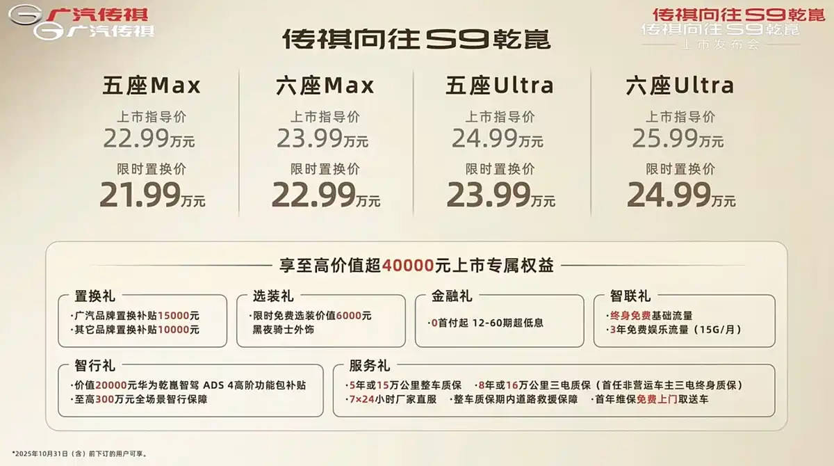 9月19日晚,广汽传祺向往S9正式官宣上市,推出4款配置车型,指导价区间为22.99-25.99万元,限时置换价区间为21.99-24.99万元。另外,还有综合上市礼包优益配资,价值超40000元。
